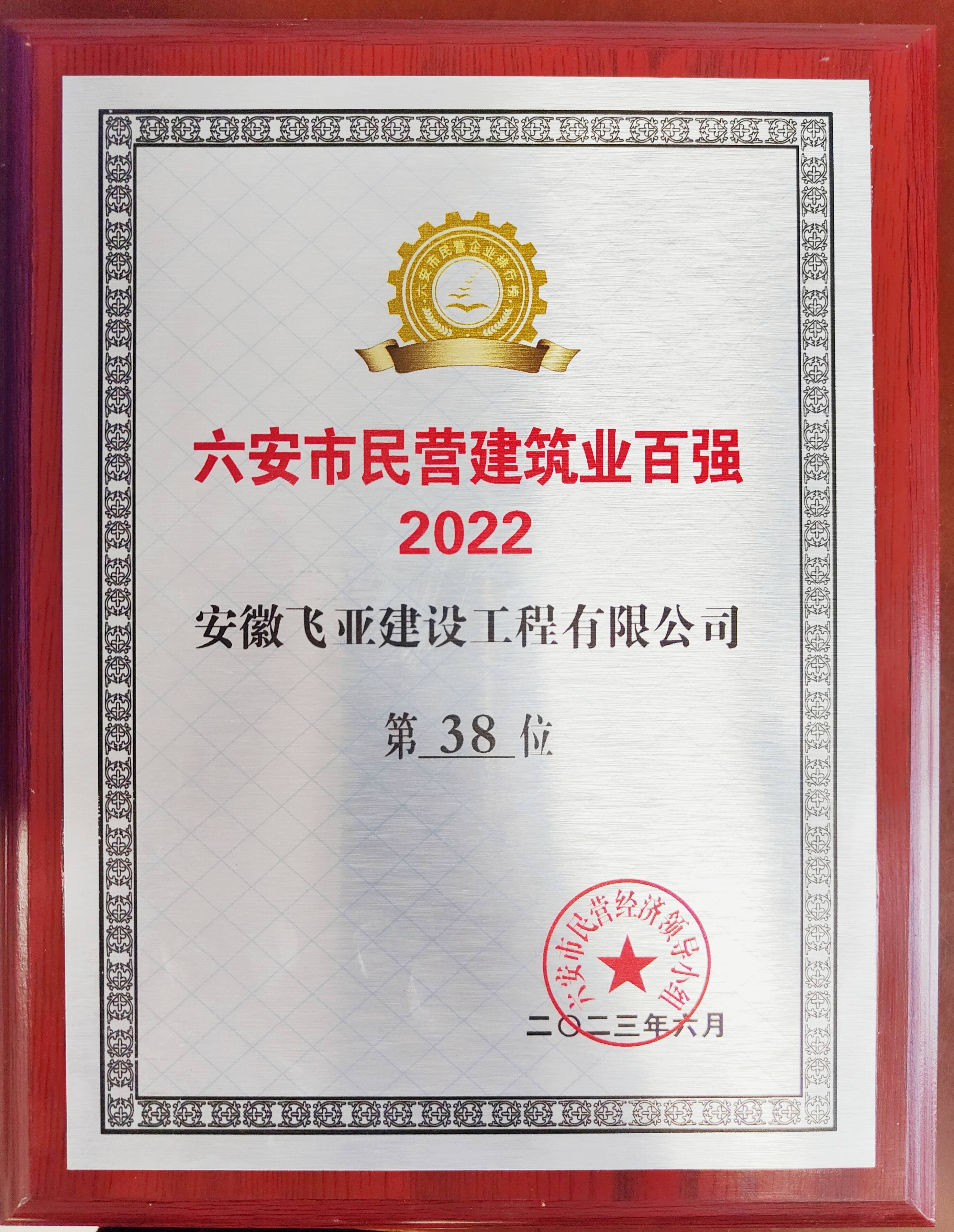 安徽飞亚公司入选六安市民营建筑业企业百强(第38位)